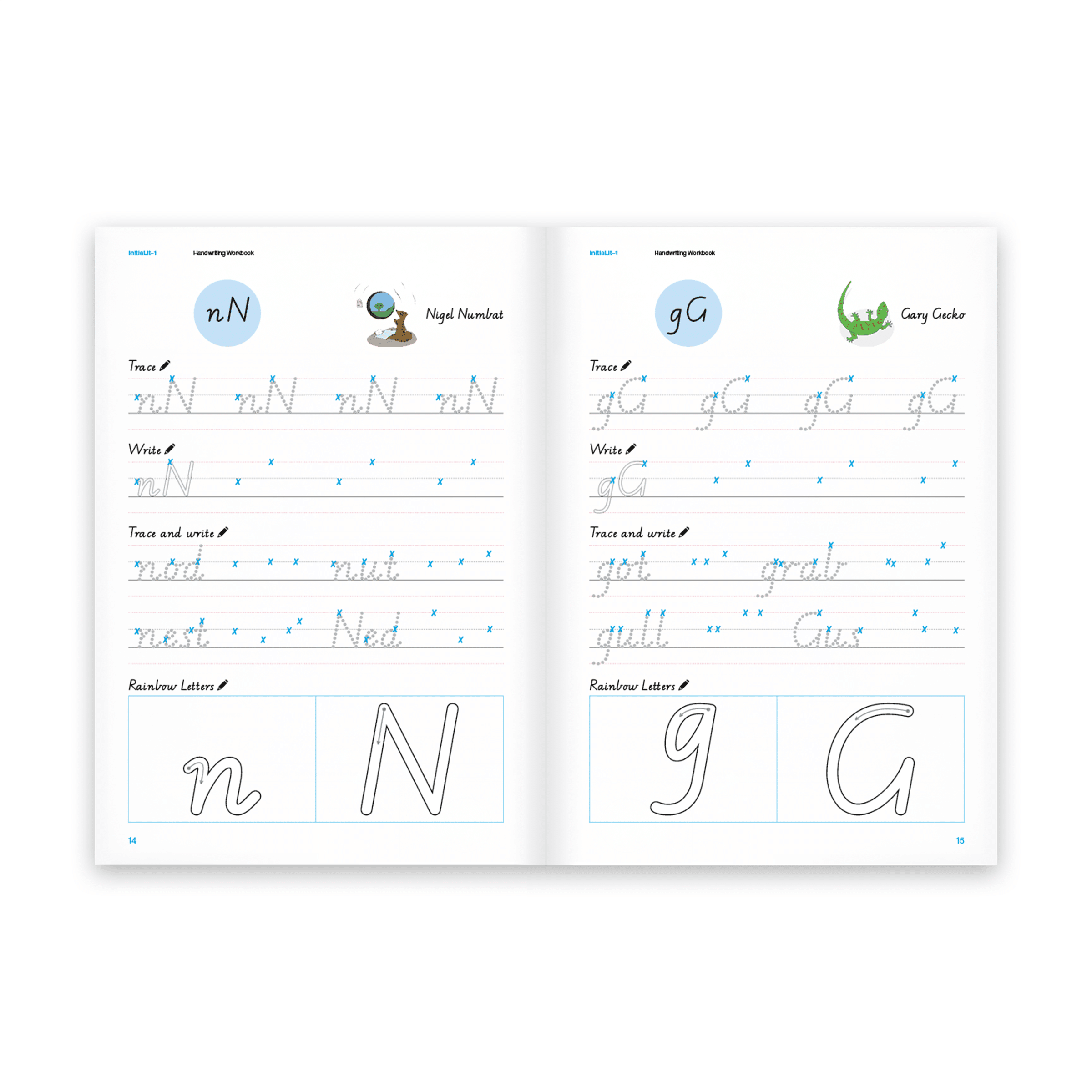A pack of five student workbooks containing all InitiaLit–1 handwriting worksheets for the year, using Victorian font and handwriting lines (single solid base line).